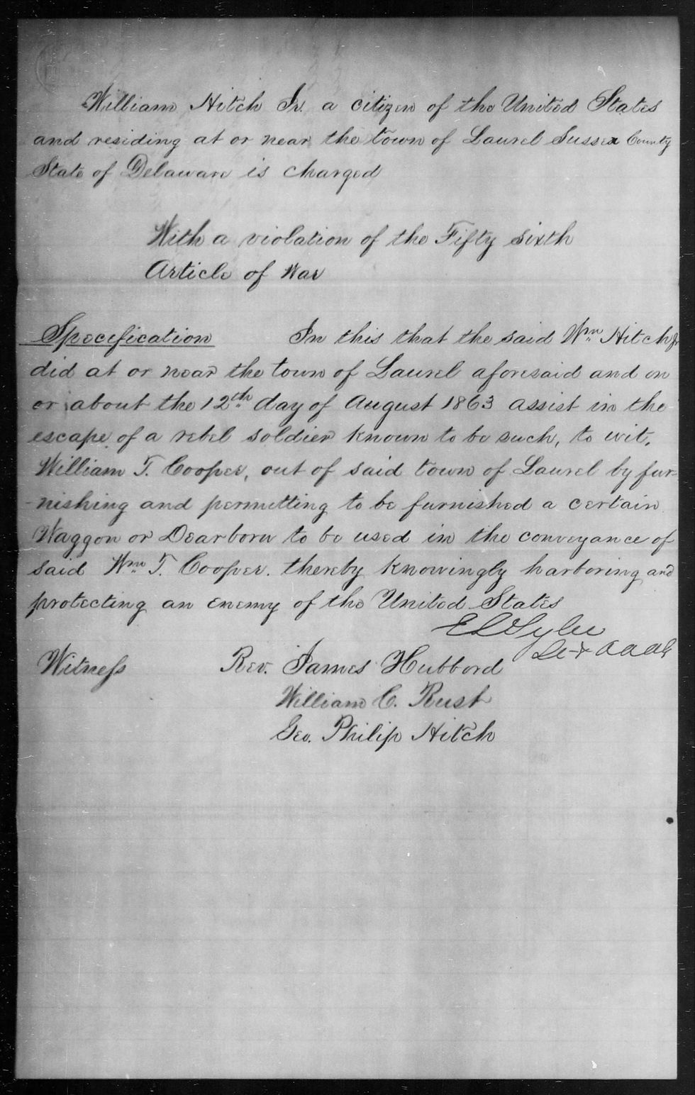 Then, evidently, Dr. Hitch crossed the line as seen in the attached letter (below) where he was found guilty of aiding a Confederate soldier to escape the area near Laurel. The body of the letter states, "In this that the said William Hitch Jr. did at or near the Town of Laurel aforesaid and on or about the 12th Day of August 1863 assist in the escape of a rebel soldier known to be such to wit, William T. Cooper, out of said Town of Laurel by furnishing and permitting to be furnished a certain Waggon (sic) or Dearborn to be used in the conveyance of said Wm. T. Cooper thereby knowingly harboring and protecting an enemy of the United States." The letter was signed by Ed Gylee? but, that is not the surprising part of this as the witnesses signing were William C. Rust and Dr. Hitch's own younger brother Geo. Philip Hitch! William Hitch was taken as a political prisoner by the Union Army.